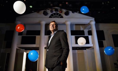 When the theater's creative team needed help making Chandler's campaign look real, they didn't have to look very far: Schriefer, a longtime theater fan, serves on the Signature board.